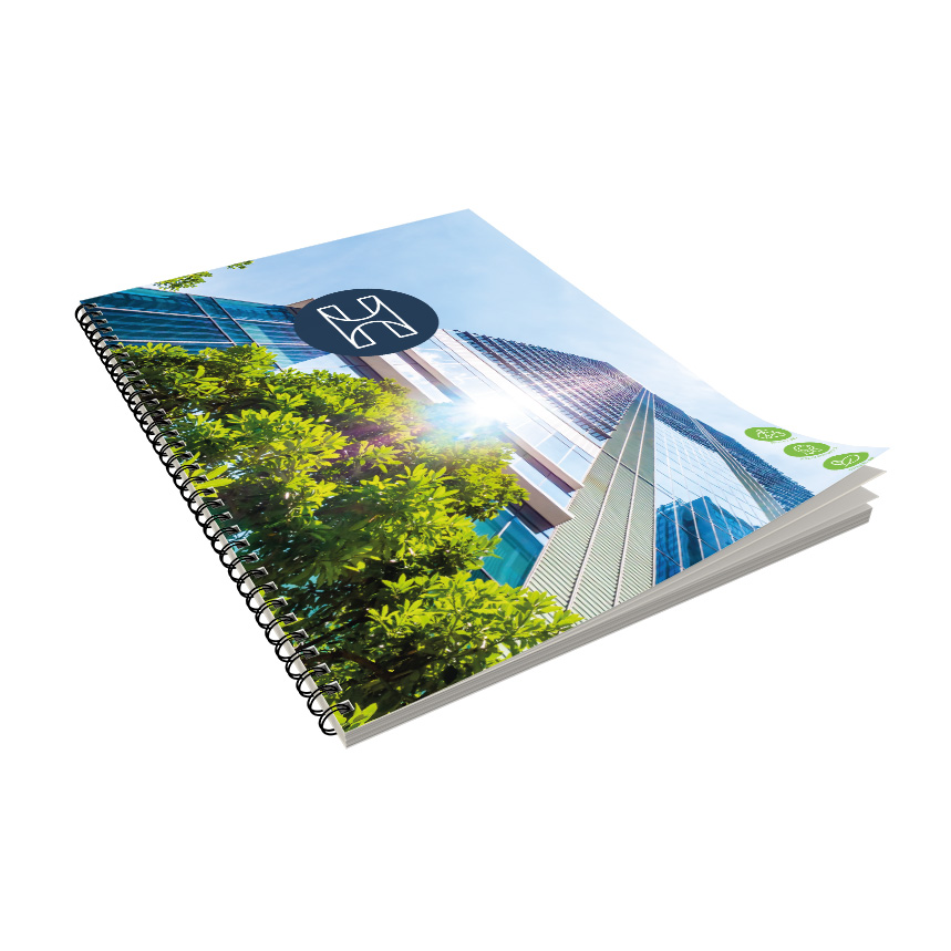 Schreibblock DIN A4 mit Ring-Wire, Innenblätter ohne Druck, Umschlag Digitaldruck, Umschlag: 300 g/m² Recycling Chromokarton, Innenblätter: 80 g/m² Matt weiß Recycling-Offset, FSC möglich, chlorfrei gebleicht, 50 Blatt, Druck: Digitaldruck, Verarbeitung: einseitig Ring-Wire gebunden