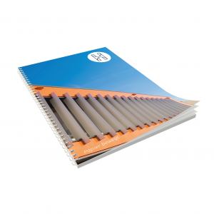 Schreibblock DIN A4 mit Ring-Wire, Umschlag: 250 g/m² Chromokarton, Innenblätter: 70 g/m² holzfrei weiß, FSC möglich, chlorfrei gebleicht, 50 Blatt, Druck: Offsetdruck, Verarbeitung: einseitig Ring-Wire gebunden