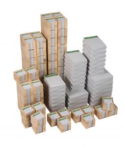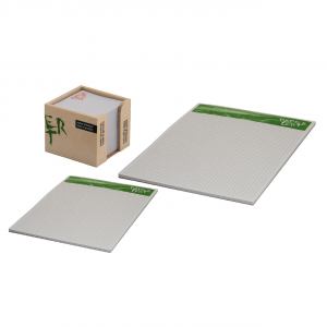 Schreibseit Green-Line, 435 Teile: 110 Schreibblocks DIN A4 à 40 Blatt, am Kopf verleimt, 220 Schreibblocks DIN A5 à 40 Blatt, am Kopf verleimt, 105 Holzboxen 10 x 10 x 8,5 cm, Füllung der Holzbox: 80 g/m² Matt oberflächengeleimt weiß Recycling-Offset aus 100 % Altpapier, FSC möglich, Verpackung: einzeln in Klarsichtfolie eingeschweißt