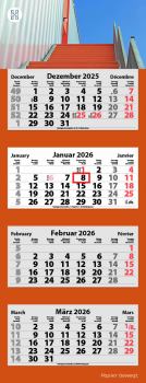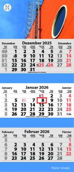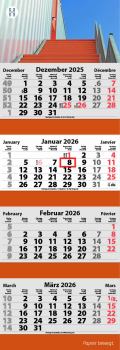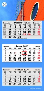 3-Monats Faltkalender, Kalendarium: 3-sprachig D/GB/F, Feiertage: GB/F/D/NL/A/CH/I, Kalenderblätter: 70 g/m² holzfrei weiß, chlorfrei gebleicht, Rückwand: 300 g/m² Chromokarton, Kalendarien in rot und grau, Verarbeitung: Rückwand gerillt, mit Metalloese, Kalendarium kopfgeleimt, Format offen: 38 x 78,7 cm, Format Kalenderblock 34 x 15,8 cm, Datumschieber: rot, einzeln umlegt, Einzelversand möglich, Kalenderblätter inkl. FSC Logo