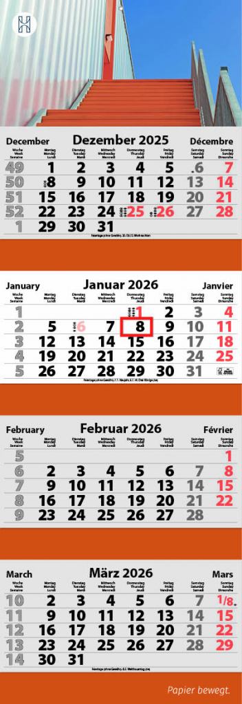 4-Monats Faltkalender, Kalendarium: 3-sprachig D/GB/F, Feiertage: GB/F/D/NL/A/CH/I, Kalenderblätter: 70 g/m² holzfrei weiß, chlorfrei gebleicht, Rückwand: 300 g/m² Chromokarton, Kalendarien in rot und grau, Verarbeitung: Rückwand gerillt, mit Metalloese, Kalendarium kopfgeleimt, Format offen: 34 x 99 cm, Format Kalenderblock 34 x 15,8 cm, Datumschieber: rot, einzeln umlegt, Einzelversand möglich, Kalenderblätter inkl. FSC Logo