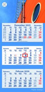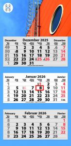 3-Monats Faltkalender, Kalendarium: 3-sprachig D/GB/F, Feiertage: GB/F/D/NL/A/CH/I, Kalenderblätter: 70 g/m² holzfrei weiß, chlorfrei gebleicht, Rückwand: 300 g/m² Chromokarton, Kalendarien in rot und grau oder in rot und blau, Verarbeitung: Rückwand gerillt, mit Metalloese, Kalendarium kopfgeleimt, Format offen: 33 x 68 cm, Format Kalenderblock 30 x 14 cm, Datumschieber: rot, einzeln umlegt, Einzelversand möglich, Kalenderblätter inkl. FSC Logo