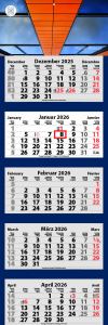 5-Monats Faltkalender, Kalendarium: 3-sprachig D/GB/F, Feiertage: GB/F/D/NL/A/CH/I, Kalenderblätter: 70 g/m² holzfrei weiß, chlorfrei gebleicht, Rückwand: 300 g/m² Chromokarton, Kalendarien in rot und grau oder in rot und blau, Verarbeitung: Rückwand gerillt, mit Metalloese, Kalendarium kopfgeleimt, Format offen: 33 x 99.4 cm, Format Kalenderblock 30 x 14 cm, Datumschieber: rot, einzeln umlegt, Einzelversand möglich, Kalenderblätter inkl. FSC Logo