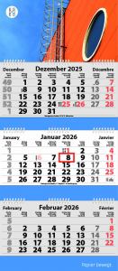 3-Monats Faltkalender, Kalendarium: 3-sprachig D/GB/F, Feiertage: GB/F/D/NL/A/CH/I, Kalenderblätter: 70 g/m² holzfrei weiß, chlorfrei gebleicht, Rückwand: 300 g/m² Chromokarton, Kalendarien in rot und grau, Verarbeitung: Rückwand Ring-Wire gebunden, mit Metalloese, Kalendarium mit Ring-Wire Bindung, Format offen: 34 x 77,7 cm, Format Kalenderblock 34 x 15,8 cm, Datumschieber: rot, einzeln umlegt, Einzelversand möglich, Kalenderblätter inkl. FSC Logo