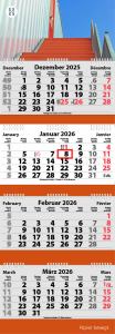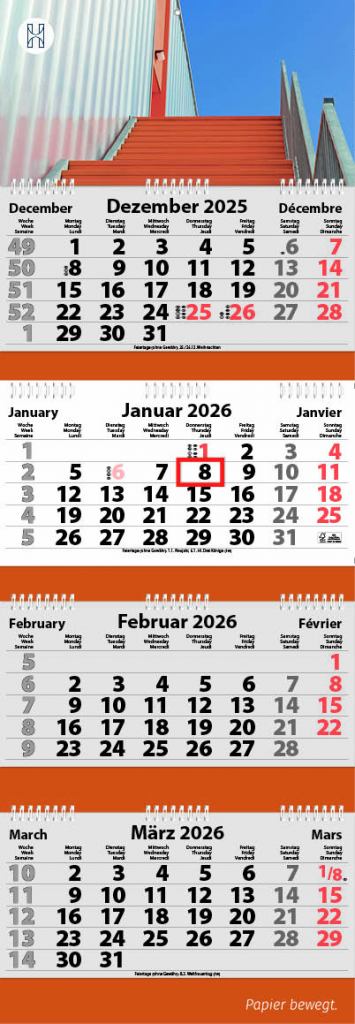 4-Monats Faltkalender, Kalendarium: 3-sprachig D/GB/F, Feiertage: GB/F/D/NL/A/CH/I, Kalenderblätter: 70 g/m² holzfrei weiß, chlorfrei gebleicht, Rückwand: 300 g/m² Chromokarton, Kalendarien in rot und grau, Verarbeitung: Rückwand Ring-Wire gebunden, mit Metalloese, Kalendarium mit Ring-Wire Bindung, Format offen: 34 x 97.9 cm, Format Kalenderblock 34 x 15,8 cm, Datumschieber: rot, einzeln umlegt, Einzelversand möglich, Kalenderblätter inkl. FSC Logo