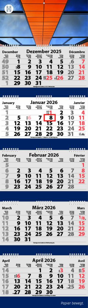 5-Monats Faltkalender, Kalendarium: 3-sprachig D/GB/F, Feiertage: GB/F/D/NL/A/CH/I, Kalenderblätter: 70 g/m² holzfrei weiß, chlorfrei gebleicht, Rückwand: 300 g/m² Chromokarton, Kalendarien in rot und grau, Verarbeitung: Rückwand Ring-Wire gebunden, mit Metalloese, Kalendarium mit Ring-Wire Bindung, Format offen: 34 x 118.1 cm, Format Kalenderblock 34 x 15,8 cm, Datumschieber: rot, einzeln umlegt, Einzelversand möglich, Kalenderblätter inkl. FSC Logo