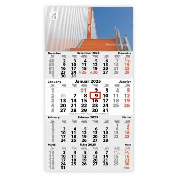 DIN A3 Kalender, Kalendarium: 1 bis 3-sprachig je nach Kalendarium, Feiertage: D oder GB/F/D/NL/A/CH/I/E je nach Kalendarium, Kalenderblätter: 70 g/m² holzfrei weiß, chlorfrei gebleicht, Kopflasche 300 g/m² Chromokarton, Kalendarien in rot und grau, Verarbeitung: Kopflasche angeheftet, alternativ Ring-Wire gebunden, mit Lochbohrung, durch Treppenperforation auf B4 faltbar (B4-Versandumschlag), Format offen: 29,6 x 57 cm, Format Kalenderblock 29,6 x 42 cm, Datumschieber: rot, einzeln umlegt, Einzelversand möglich