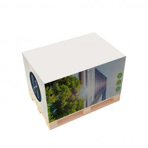 Palettenblock mit Kunststoffpalette 12 x 8 x 6 cm, Papier: 90 g/m² holzfrei weiß, chlorfrei gebleicht, Seitenflächen: Digitaldruck, Verpackung: einzeln in Klarsichtfolie eingeschweißt